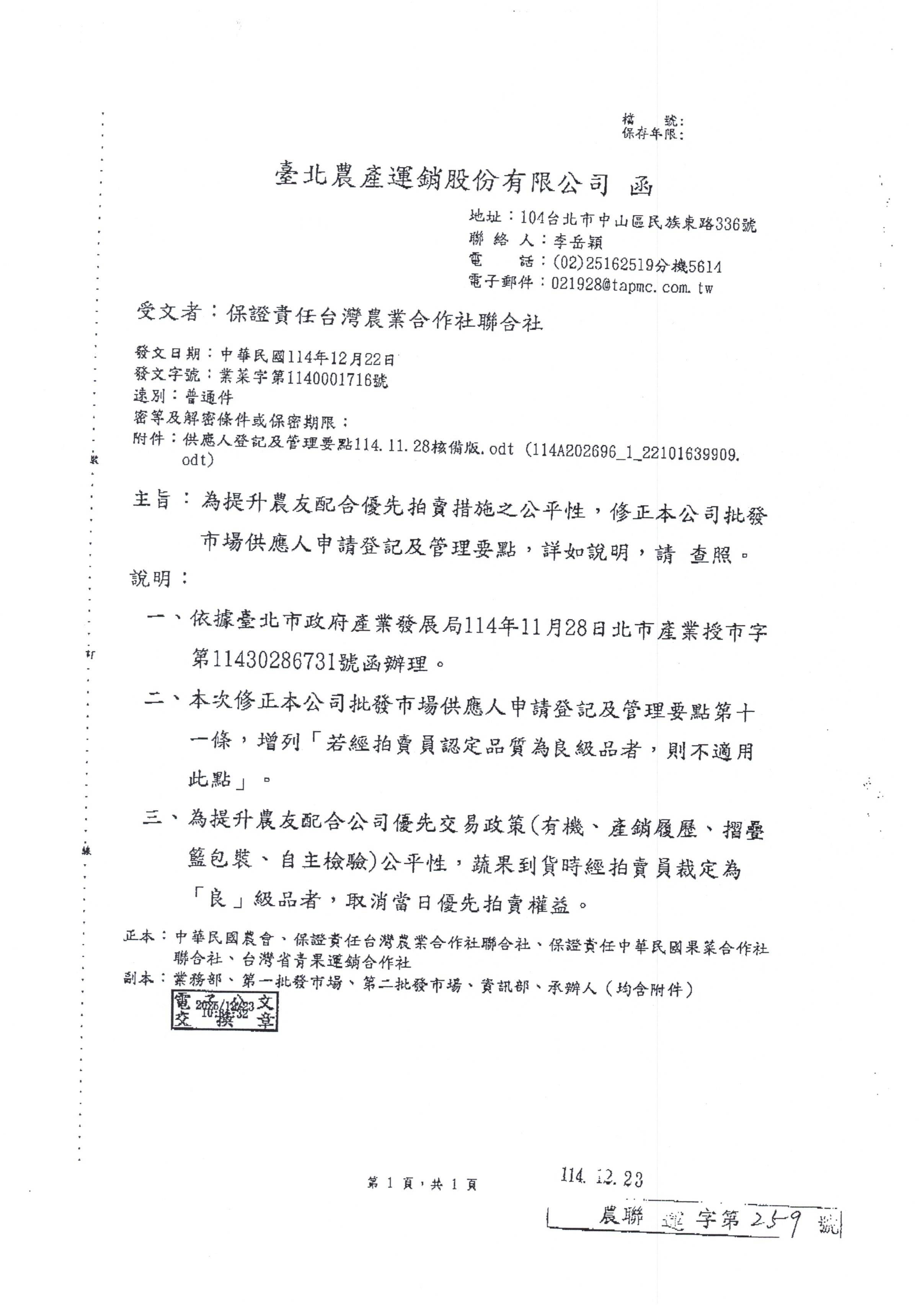 轉知有關台北農產公司優先拍賣措施及修正供應人管理要點相關訊息...函文 / 附件